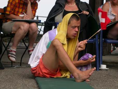 Marshalls kurze Vorstellung von Uwe nach einer halben Stunde kam dann auch sehr überraschend und sorgte für weitere Verwirrung. Er sagte: Darf ich euch meinen Kollegen Uwe vorstellen. Uwe ist jemand, der mich besser kennt als ich mich selber, auch wenn das auf den ersten Blick nicht so aussieht. Er war auch auf meinem vorherigen Seminar und es tut ihm sehr gut hier sein zu können. Uwe schien das zu verstehen und quittierte es mit einem lauten Uuuh-aaah! Dies sollte der Anfang einer Reise in eine fremde Welt für uns werden, die keinen unberührt ließ. Aber noch wussten wir das nicht und es bleib bei einer Irritation. Neben seiner Unruhe verwirrten auch seine unbeholfenen Kontaktversuche, wie zum Beispiel blitzschnell jemandem, der in der Nähe saß, eine Socke auszuziehen oder jemanden zu sich auf die Matratze zu ziehen. Erfreulicherweise gab es auch Phasen, wo er einfach schlief und nur ein Schnarchen an seine Gegenwart erinnerte.