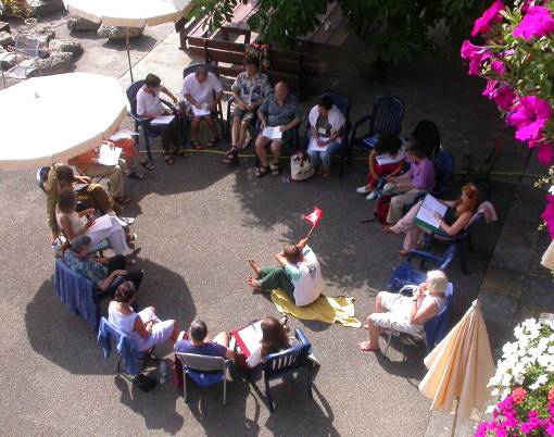 Betretenes Schweigen im Raum. Lange sagt niemand etwas, dann drücken Einzelne ihre Betroffenheit aus und danken für die Offenheit. Es sollte nicht die letzte Botschaft sein und öfters konnten wir auch live miterleben wie Uwe auf diese Weise sich verständlich machte, wenn ihn etwas sehr bewegte. Zum Beispiel fing er einmal während eines Vortrages von Marshall urplötzlich an zu schreien und sich die Ohren zuzuhalten. Dies geschah, als Marshall an einer Stelle über den alltäglichen Kampf zwischen Gut und Böse, wie er im Fernsehen dargestellt wird, sprach. Die Guten besiegen immer mit Gewalt die Bösen und töten sie meistens auch noch. Dieses Konfliktlösungsmodell lernen Kinder in fast allen Filmen in durchschnittlich 6 Stunden täglich (in USA). Für Uwe schien dieses Thema schmerzhafte Erinnerungen auszulösen. Er wirkt verstört, schreit gequält und läuft hin und her. Marshall schaut ihm nur still zu und fühlt sich in ihn ein. Nach ca. 5 Minuten hockt sich Uwe auf den Boden und wippt und wedelt mit einem Schweizer Fähnchen vor seinem Gesicht, dann zieht er eine Teilnehmerin zu sich herunter und kurz darauf eine weitere. Alle machen es sich bequem, Uwe angelehnt an die eine und gestreichelt von der anderen. Bei einer anderen Gelegenheit wird Marshall von Uwe zu sich runter gezogen und bleibt bei ihm bis er sich beruhigt hat. Szenen, die viele berühren.